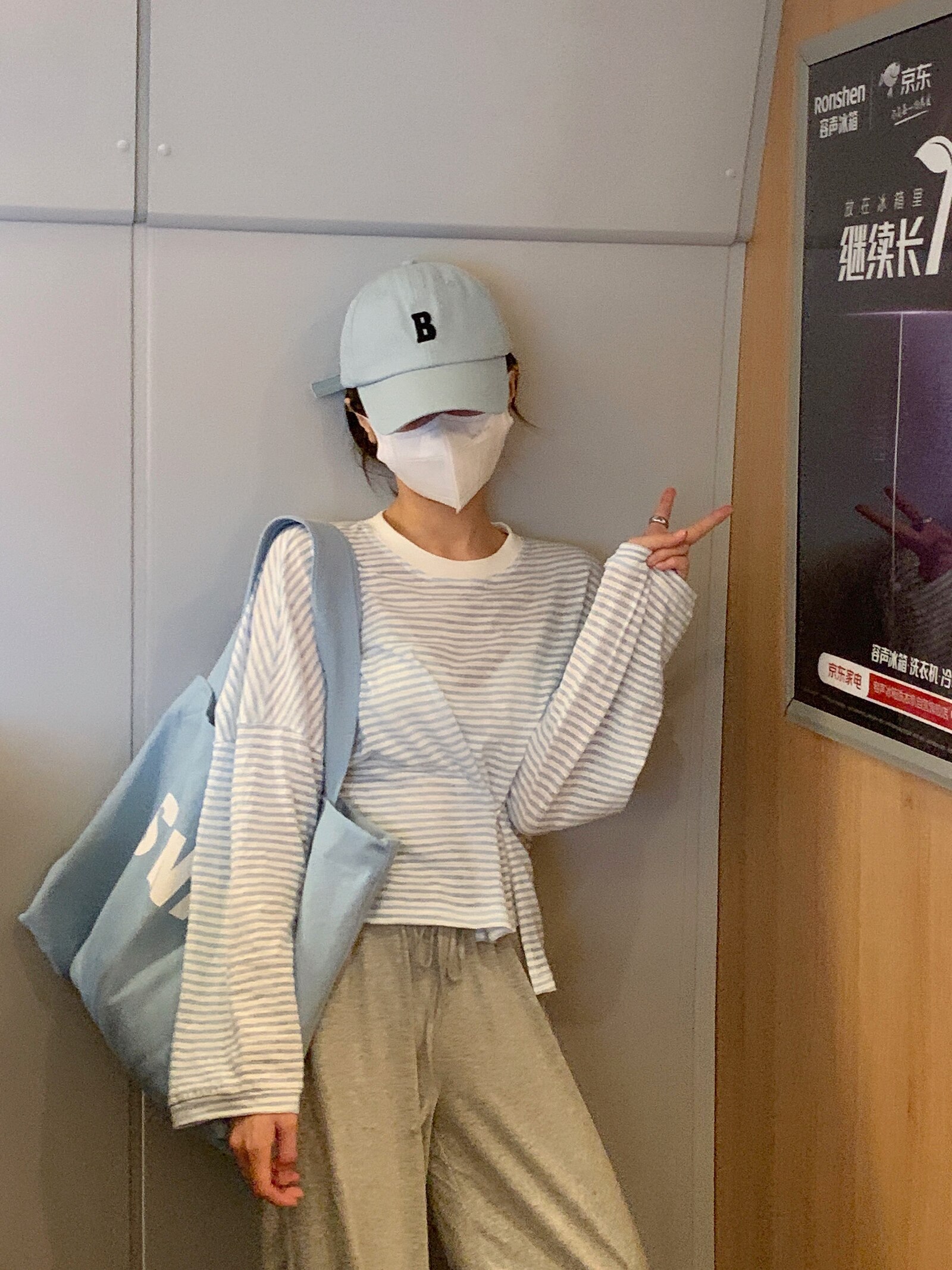 饭小队午后蝉鸣 蓝白设计感纽扣收腰纯棉条纹tee热门设计联盟服务商