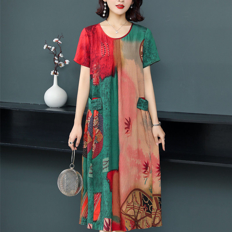 2022年气质妈妈装夏季连衣裙大码显瘦中老年人锦棉睡裙过膝长裙子热门设计联盟服务商