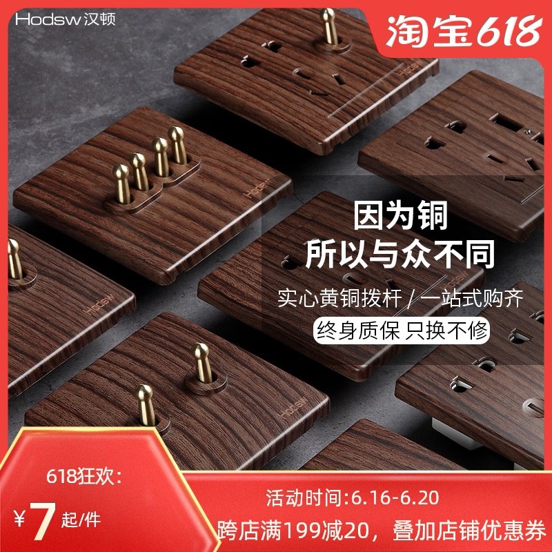 汉顿BE木纹色复古拨杆开关中式电源插座面板家装工装套装暗装五孔热门设计联盟服务商